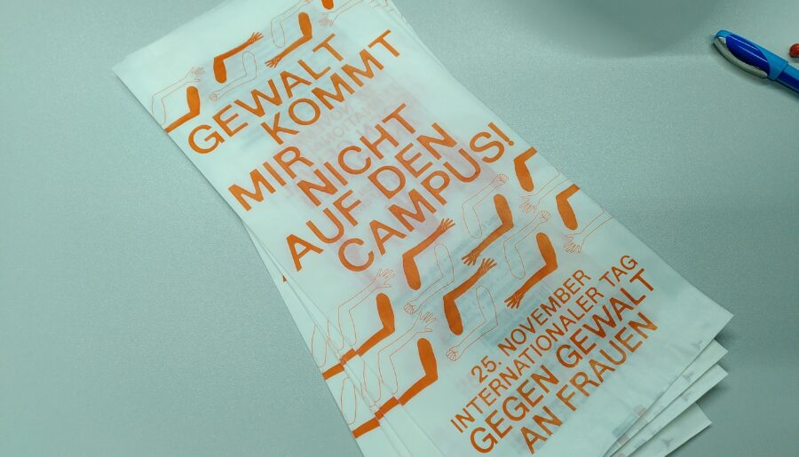 Zusätzlich zur Vortragsreihe wird eine Brötchentütenaktion an insgesamt 30 Hochschulen in ganz NRW stattfinden. Sie soll das Thema in die Öffentlichkeit tragen und auch Menschen erreichen, die sich nicht regelmäßig mit Gewaltprävention oder den Erfahrungen von FLINTA-Personen auseinandersetzen. Auf den Brötchentüten, die in den Cafeteterien und Mensen ausliegen, findet sich eine klare Botschaft „Gewalt kommt mir nicht auf den Campus“. Außerdem gibt es Informationen zu Hilfsangeboten für Betroffene.