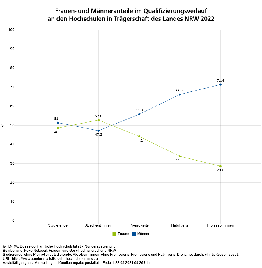 Die Koordinations- und Forschungsstelle des Netzwerks Frauen- und Geschlechterforschung NRW stellt seit 2014 jahresaktuelle genderbezogene Daten zu den 37 Hochschulen in Trägerschaft des Landes NRW online zur Verfügung. Die Daten basieren auf Sonderauswertungen der amtlichen Statistik (IT.NRW) und eigenen Erhebungen der Koordinations- und Forschungsstelle. Seit 2015 bieten wir zudem den Service an, sich die Gleichstellungsquote für Berufungsverfahren (§ 37a HG NRW) nach ausgewählten Fächerkombinationen berechnen zu lassen. Dieses Tool basiert auf bundesweiten Daten. Hier erfahren Sie mehr über das Portal und das Tool zur Quote.