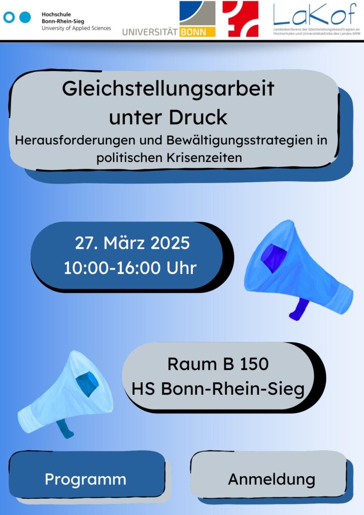 Die LaKof NRW lädt herzlich zur Frühjahrestagung 2025 ein. Wir wollen uns mit dem Thema „Gleichstellungsarbeit unter Druck“ auseinandersetzen und dabei Strategien und Handlungsmöglichkeiten zum Umgang mit aktuellen (politischen) Herausforderungen entwickeln. Die Tagung wird mit Unterstützung der Gleichstellungsbeauftragten der Hochschule Bonn Rhein Sieg und der Universität Bonn ausgerichtet.